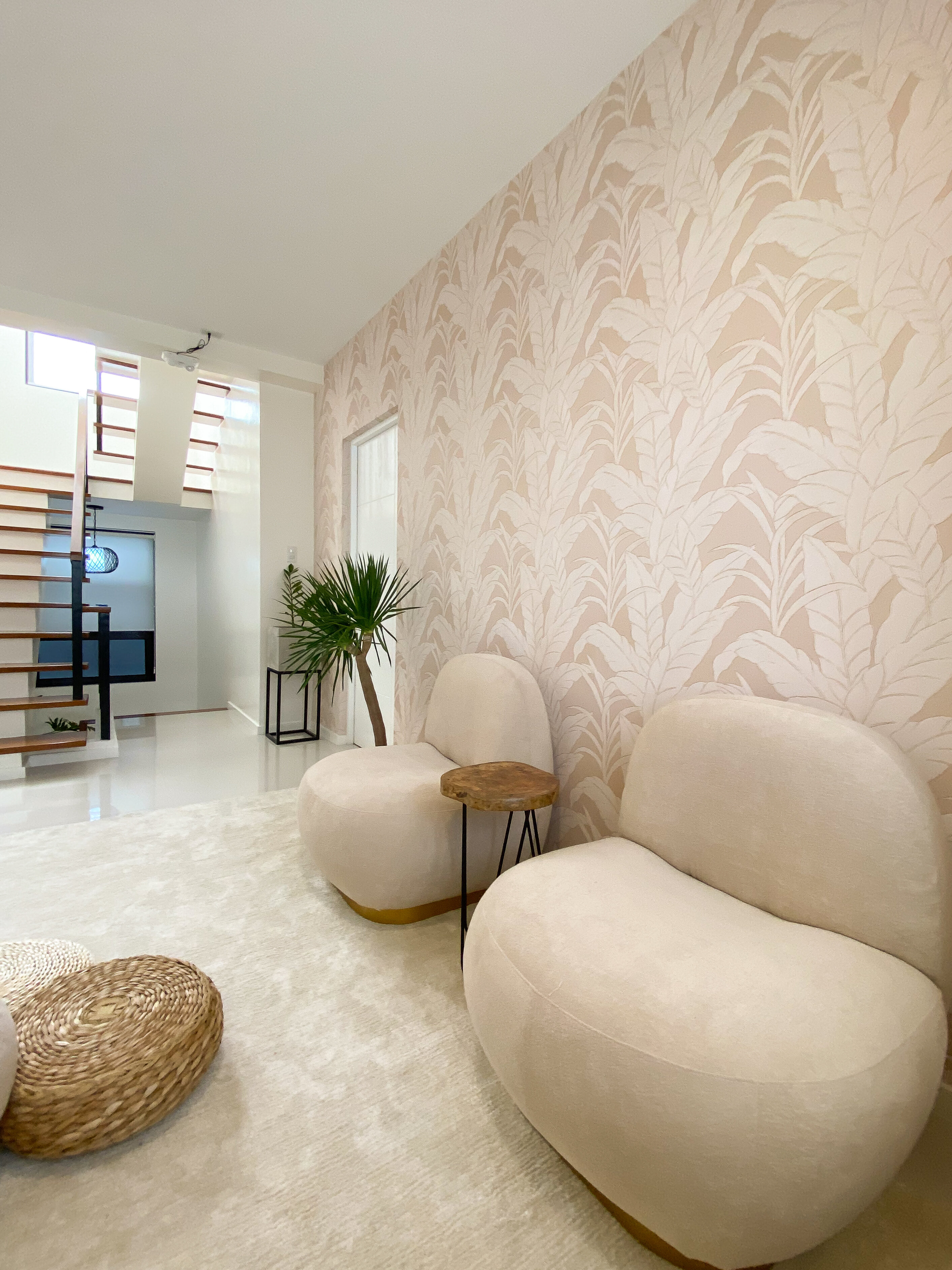 The original ceramic tile flooring and off-white paint of the den were retained to minimize renovation expenses. Creating an accent wall upgrades the look without having to spend much on revising the interior structure. The designer’s vision is to incorporate outdoor elements into the indoor space. To achieve this, the designer chose a neutral and tropical wallpaper to serve as an accent wall and background to the contemporary furniture pieces.