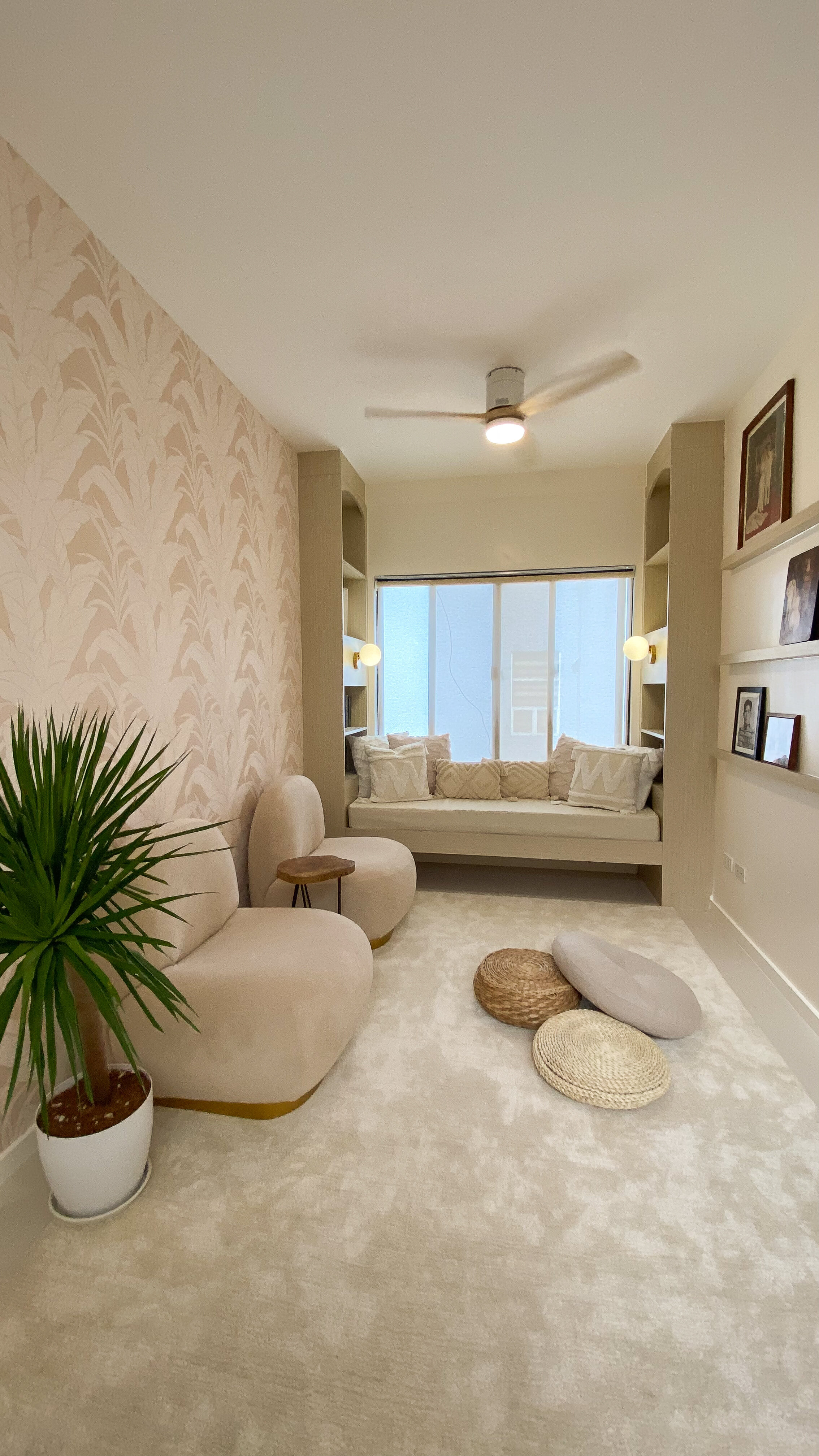 The designer transformed the family den into a relaxing but functional space for the family. A reading nook with display and storage shelves was incorporated into the window. Contemporary lounge chairs, a live edge wood side table, woven meditation cushions, and a soft pile carpet were used to bring comfort and relaxation into the space. Floating shelves were used to display family memorabilia. The indoor plant not only adds visual interest but it improves air quality in the space.