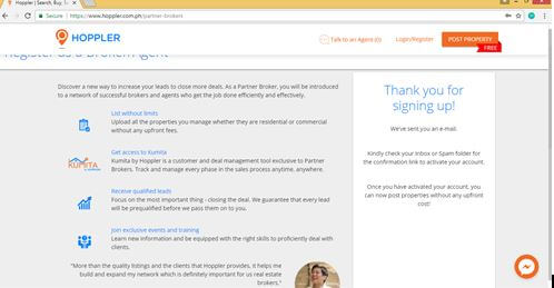 When you are done signing up, a prompt message will show. It will ask you to check your e-mail for the confirmation link to activate your account. When you click the link, you will be redirected to the Post Property page where you can start uploading your properties.