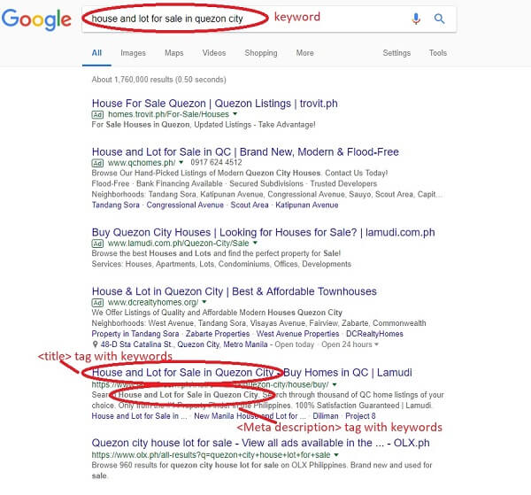 Keywords are words that people type into Google, Bing, or Yahoo when they are looking for something. When writing an ad copy for a real estate property you’re selling, you need to include appropriate keywords so prospects can easily find you. But it’s not as simple as that; setting “house and lot for sale” as your keyword won’t do the whole trick. That keyword is too used and if you don’t want to compete to gazillion agents and brokers from different parts of the world, then you should begin localizing your keywords. Say the property you’re eyeing to sell is located in Quezon City, you can add “in Quezon City” to your keyword so they can find you for specific searches. If a buyer is really eager to purchase, he’d rather specify what he really needs into his searches.