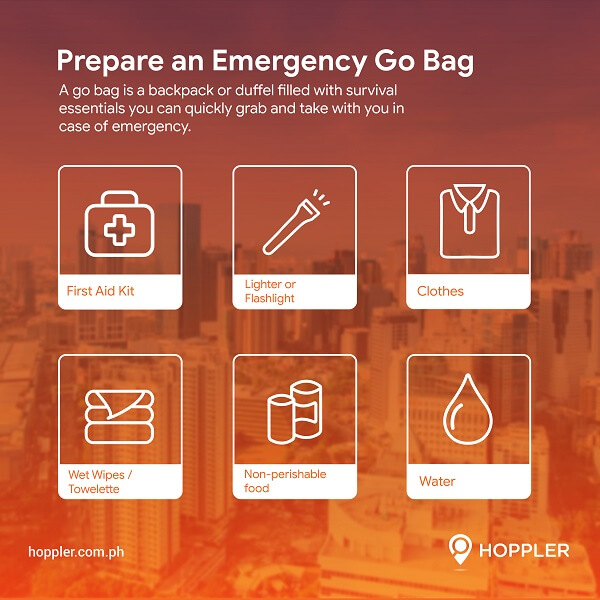 One of these steps is to prepare an emergency go bag, also known as bug-out bag or evacuation kit. A go bag is a backpack or duffel filled with survival essentials you can quickly grab and take with you in case of emergency. It’s necessary to keep the go bag in an area of your house or condo that is easily accessible so you can take it and run.