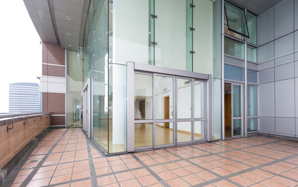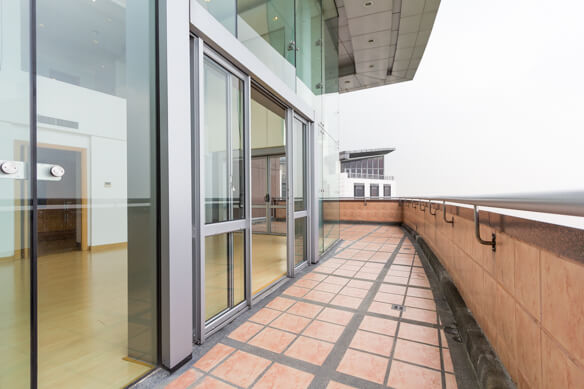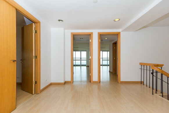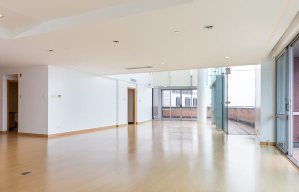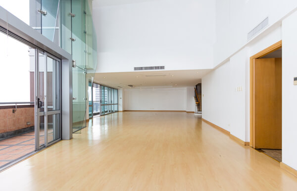 The double-height living room lets in ample light through its floor-to-ceiling glass windows. It is without dividers to encourage an unobstructed flow of light and air. Moreover, there is an extensive balcony accessible via the three glass doors in the area.