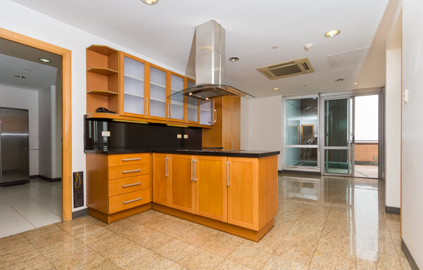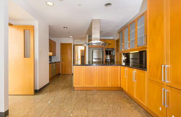 The kitchen is straightforward and has prominent wooden cabinets. It is free from unnecessary items that could disturb cooking. There are also cutting-edge appliances in the area.