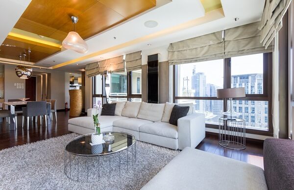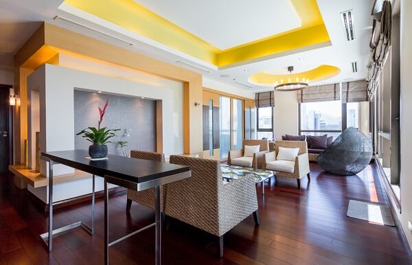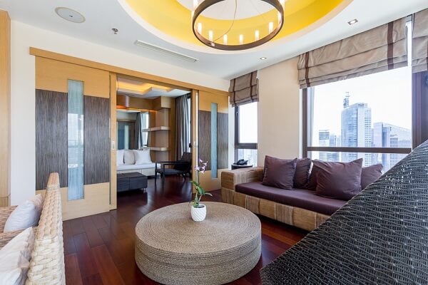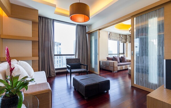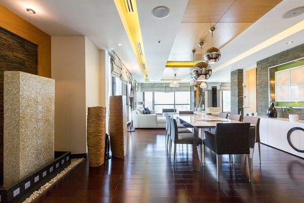There’s an extended living room adjacent to it, featuring various areas as well for hanging out. Handcrafted furniture is the signature of this condominium, adding a rustic albeit sleek touch to the overall ambiance of the home.