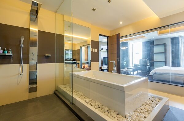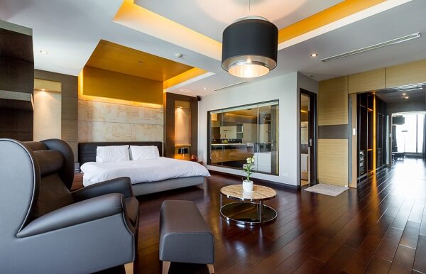 The master’s bedroom is a well-kept secret in the space. Featuring a leather bed and leather couch, the room takes a less-is-more approach. The sophistication doesn’t dwindle down, but effectively commands attention. The elegant bathroom inside epitomizes luxury through its tub at the center and walk-in shower.