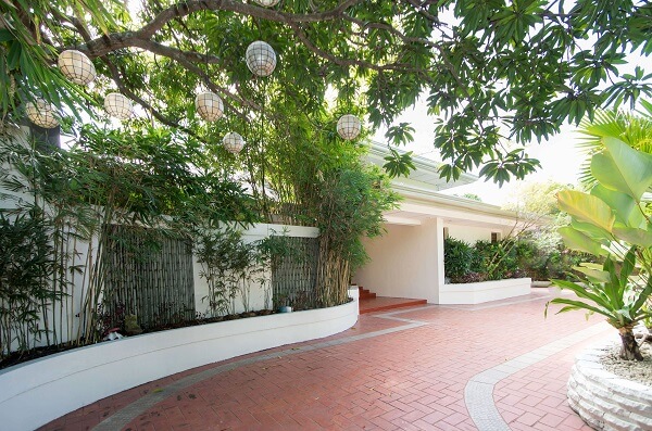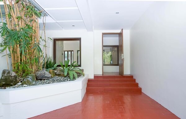 A canopy of greens greets visitors, instantaneously exuding a relaxed and calm vibe that permeates all throughout the home. The abundance of plants and bamboo forms a refreshing landscape perfectly contrasted by the red brick driveway.