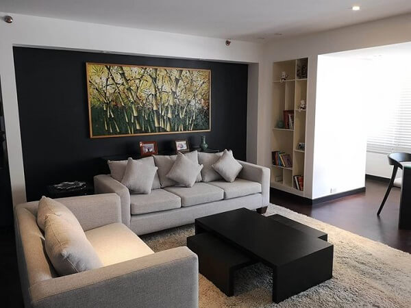 2. Using a predominantly neutral color palette, the green from the center art piece accents the space.