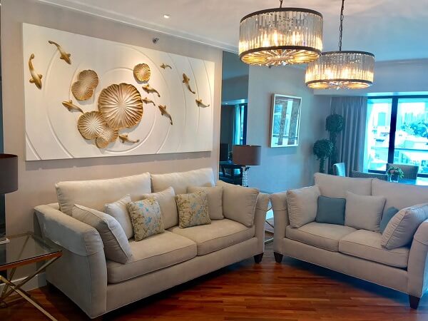 6. Elegant chandeliers and a gold sculpture add a luxurious touch to the area without taking up space.
