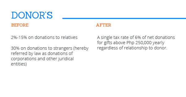 The rate of the Donor’s Tax – a tax on donation or gift, and is imposed on the gratuitous transfer of property between two or more persons who are living at the time of the transfer – is now at a flat rate of 6% regardless of the relationship between the donor and the donee from the previous 2% to 15% if the donor and the donee are related, and 30% if the donation was to a stranger.