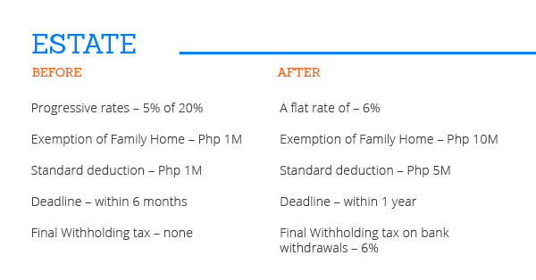 The rate of the Estate Tax – a tax imposed on the property of lawful heirs and beneficiaries inherited from a decedent – is now at a flat rate of 6% on the amount in excess of P5 million from the previous 5% to 32% rate.
