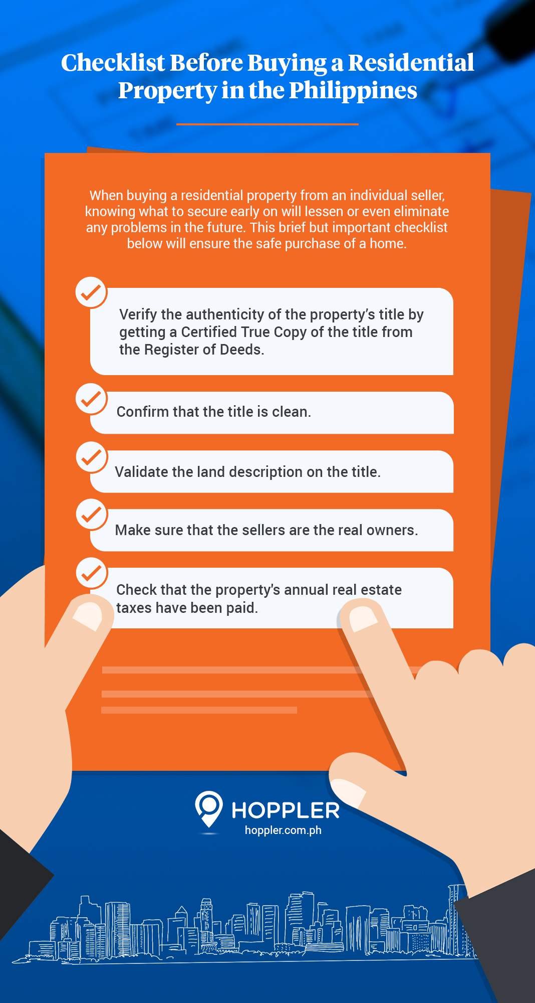The easiest way to check if the title to the property you are buying is authentic is by getting a Certified True Copy of the title from the Registry of Deeds. You’ll need a title number and property owner’s name – in this case, the seller – before you get a Certified True Copy from the Registry of Deeds.