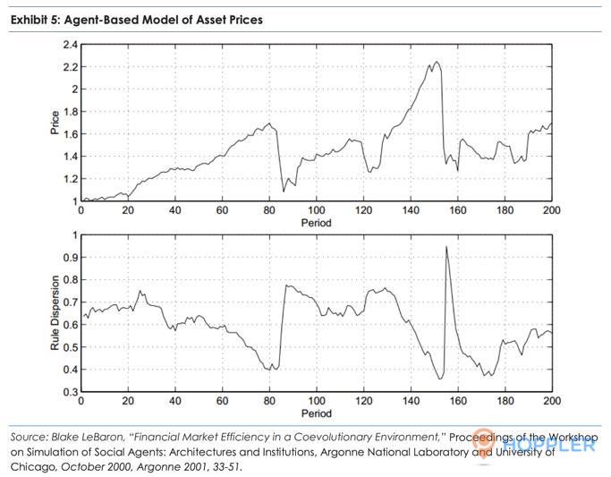 Blake LeBaron, an economist, modeled how this diverse and wise and consensus but dumb crowd works in markets to create trends and crashes. He built a computer model and imbued “agents” with decision-making rules such as: make money, try not to lose money, don’t underperform the average for long periods, etc.